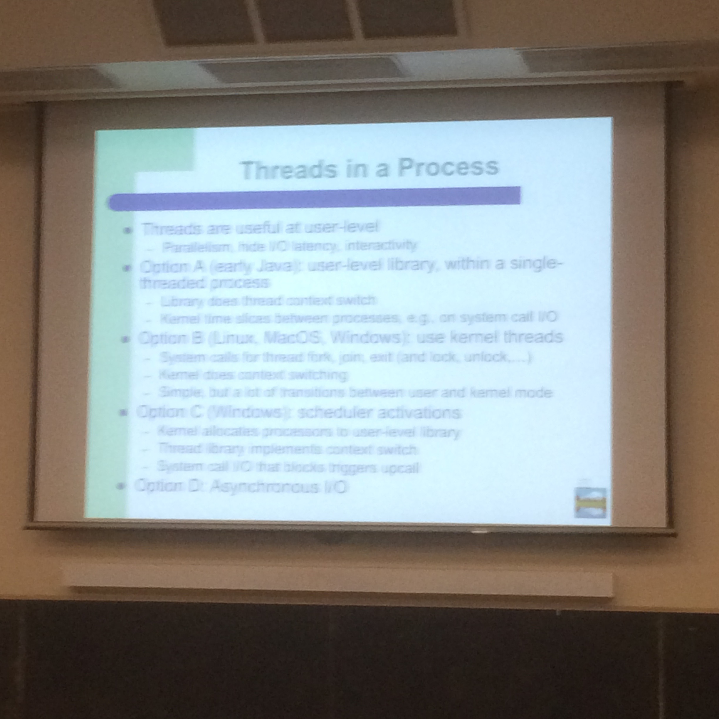 - Multiprogramming: when OS takes away kernel threads, it preempts kernel threads without knowledge of which user threads are running